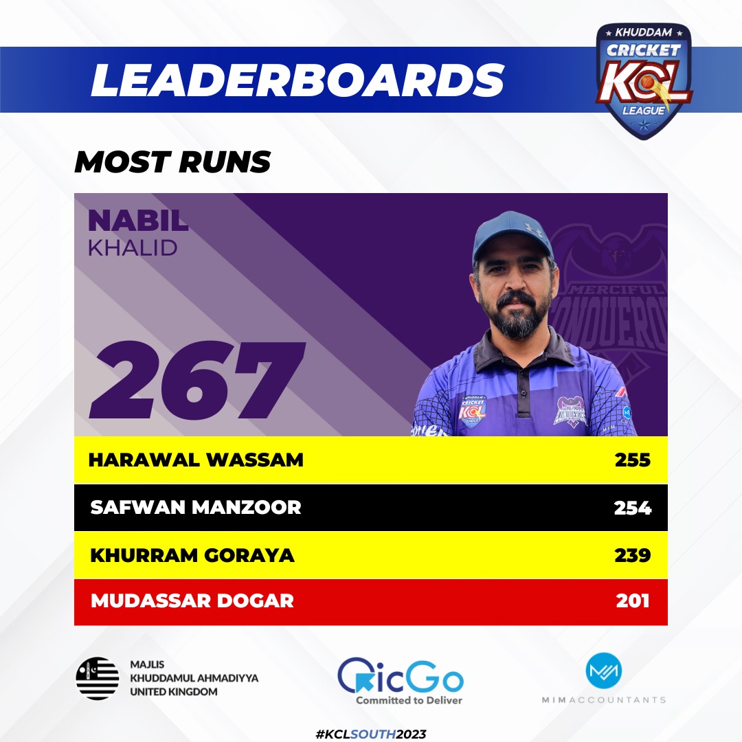 Nabil Khalid dons the top spot of the Most Runs leaderborad.