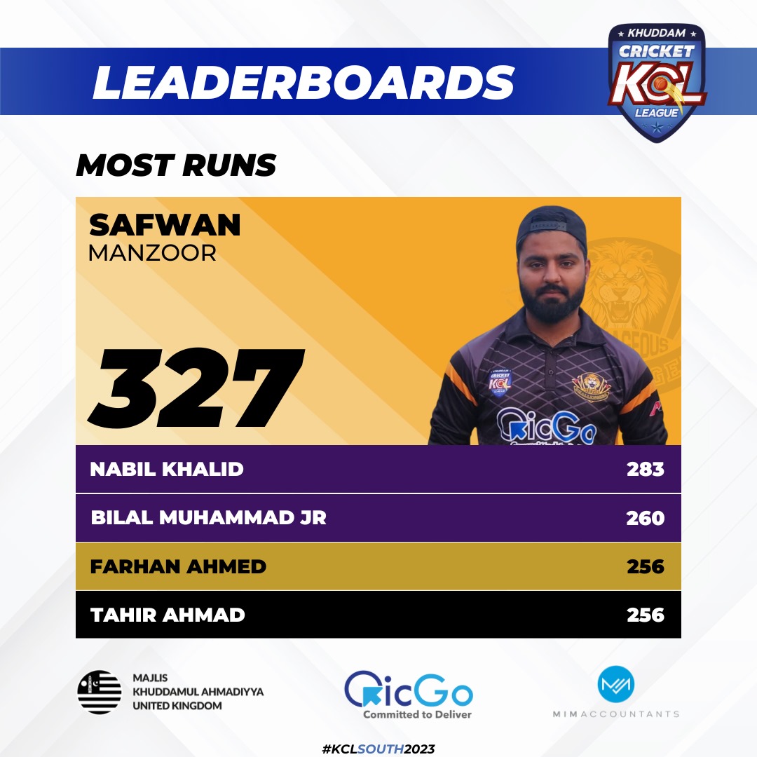 At the end of the season of KCL South 2023 September 18, 2023 Safwan Manzoor dons the top spot of the Most Runs leaderborad