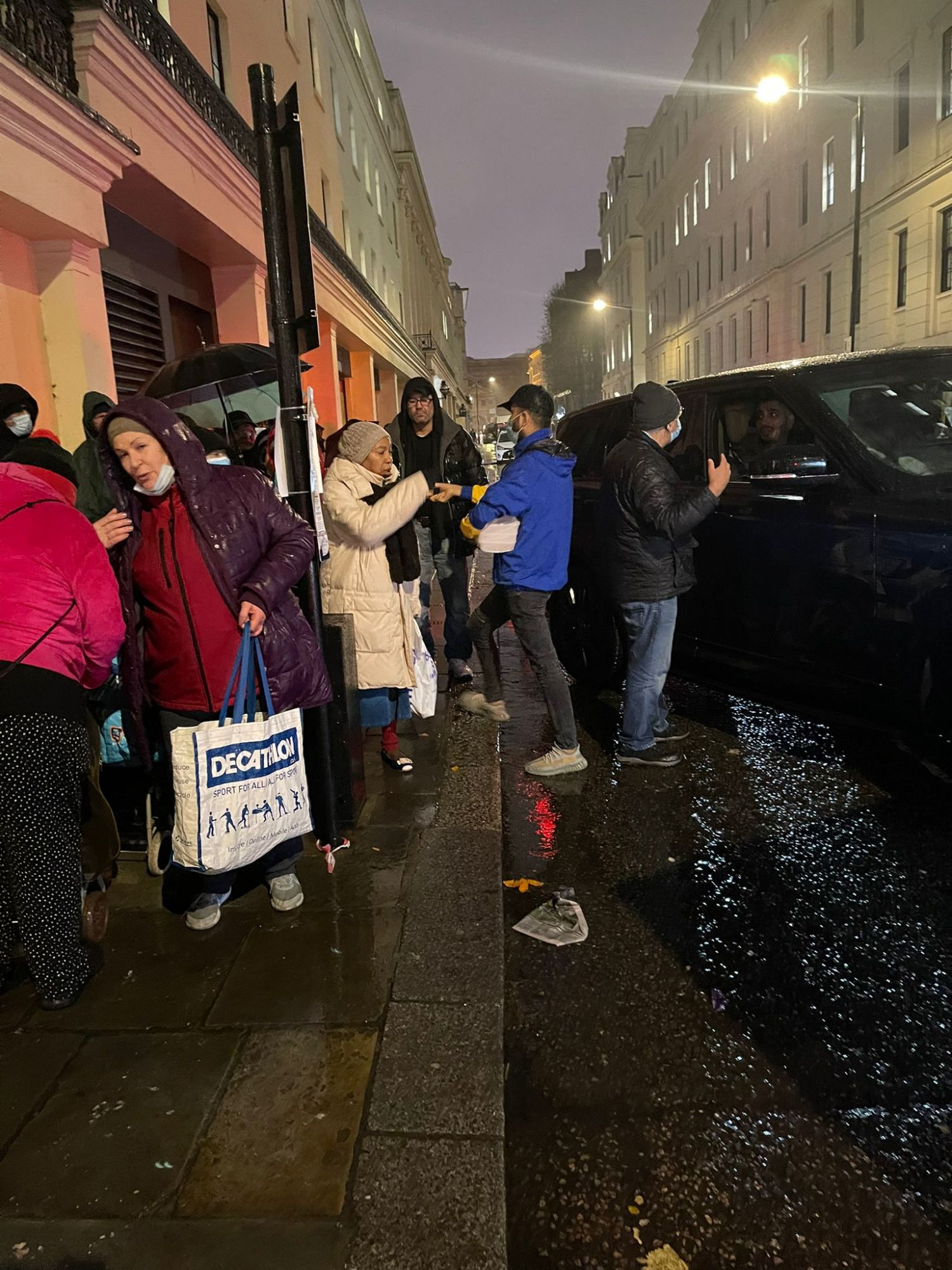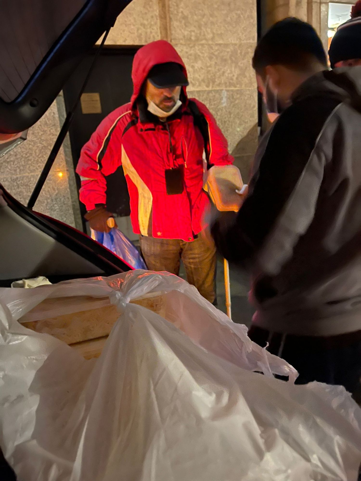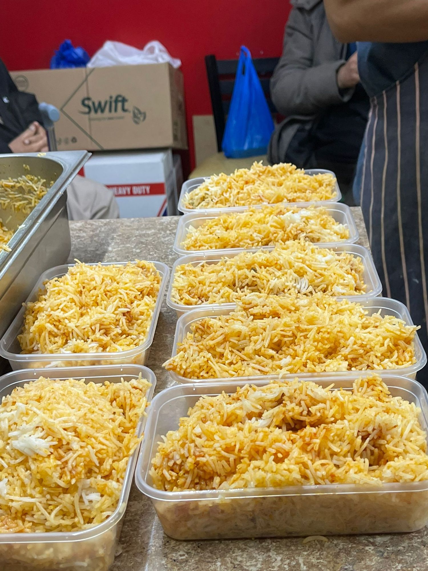 Food drive to support the homeless by Majlis Khuddam-ul-Ahmadiyya Fazl Mosque Region whilst maintaining covid protocols. 208 meals were distributed with bottled water . Food box contained chicken biryani.