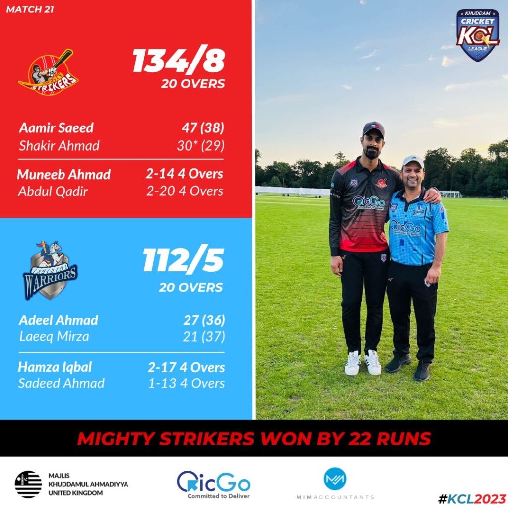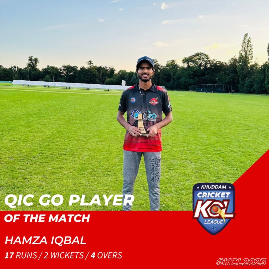 Hamza Iqbal’s spell of 2-17 in his 4 overs including his contribution of 15 runs was considered worthy of the MOTM award. A valuable 2 points for the Strikers who would feel much safer with 6 points on the board with a game in hand. The warriors however can only level 3 other teams who are already on the 6 point mark, and would require a serious net run rate to possibly advance to the next stage of this year’s KCL.
