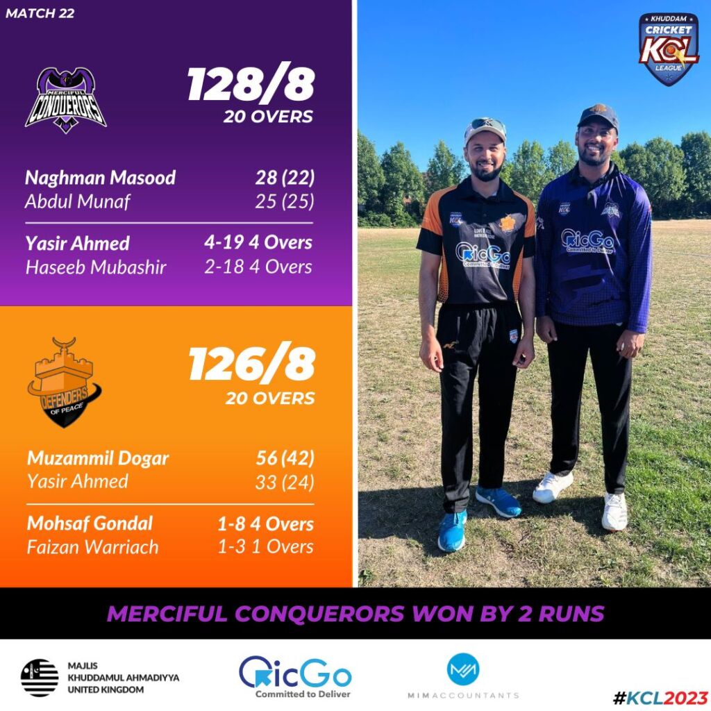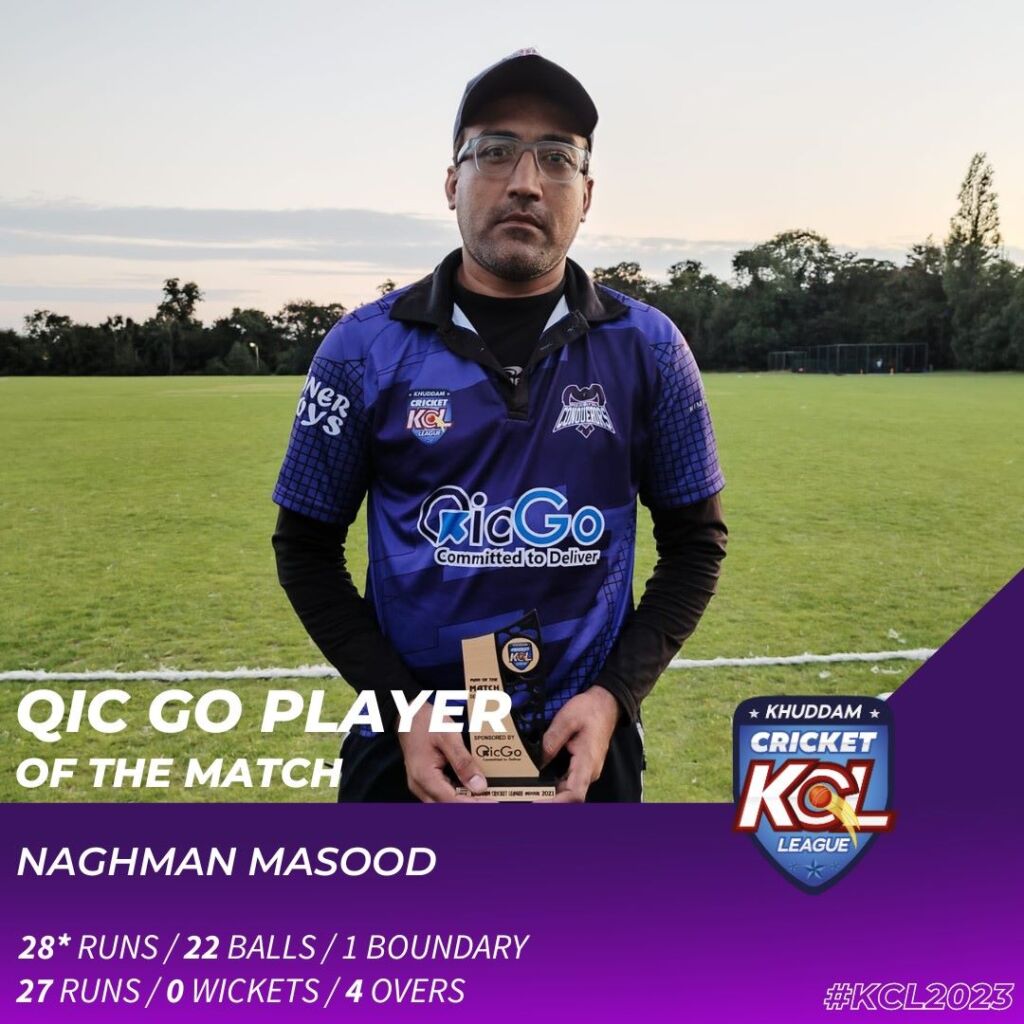 The Conquerors who would have been in big trouble had they lost today became the first side to qualify for the play offs in this year’s KCL with the 2 points. The Defenders captain Muzamil Dogar won the plaudits as the MOTM, although the efforts of Yasir Ahmed with bat and ball must also be highly appreciated. The Defenders would also need to win their last two matches now and potentially depend on results to go in their favour elsewhere if they wish to qualify for the play offs!