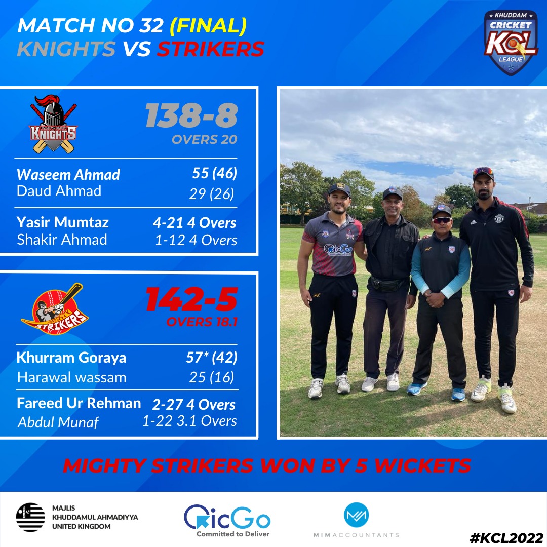 Mighty Strikers were crowned the Khuddam Cricket League champions on Sunday after they beat Trustworthy Knights by 5 wickets in the Final in Alexandra Recreation Ground, Surbiton. Opting to bat first, Knights never got going and made a below-par score of 138-10 with Waseem Ahmad topscoring for them with a rather subdued 55. Yasir Mumtaz’s bowling figures of 4-21 and captain Shakir Ahmad (1-12) led by example with the ball.