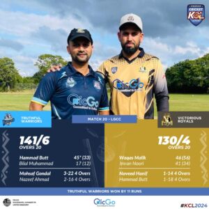 The Warriors have pulled off another famous victory defending a total from a bleak position, and this is now testimony to their strong mental fortitude, grit and will to fight to the very last ball under their leader Hammad Butt, who is inspiring this group of players to a play off spot having struggled so much last year! The Royals are still looking strong having suffered their only defeat in the season so far, they will learn from this experience going forward to ensure that they maximise their resources to their best instead of leaving it a bit too late.