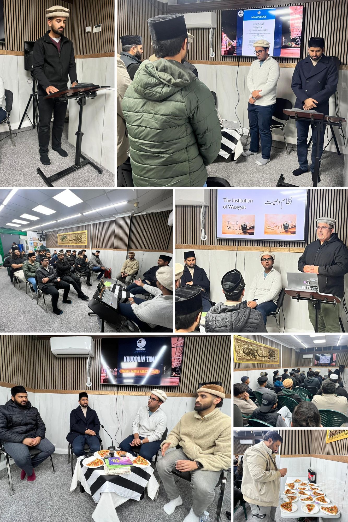 The programme was divided into two parts. The first session featured a general meeting, beginning with Tilawat, followed by the Khuddam Pledge, and then a detailed presentation on Risala Al-Wasiyat delivered by Secretary Wasaya, Farrukh Khan Sahib.
