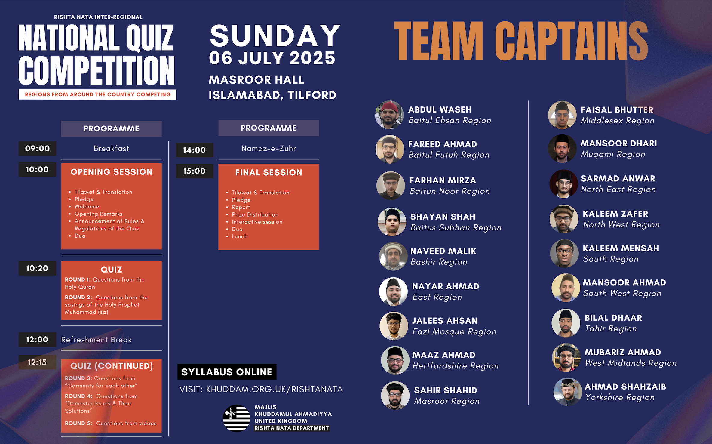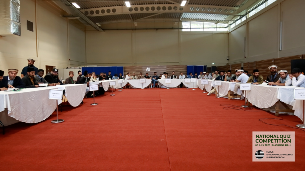 By the grace of Allah on the 6th of July 2025 Majlis Khuddamul Ahmadiyya UK held a National Quiz Competition in Masroor Hall, Islamabad, Tilford. This was organised by the Rishta Nata Department of the Majlis and was based on the theme of living a chaste life according to the teachings of Islam.