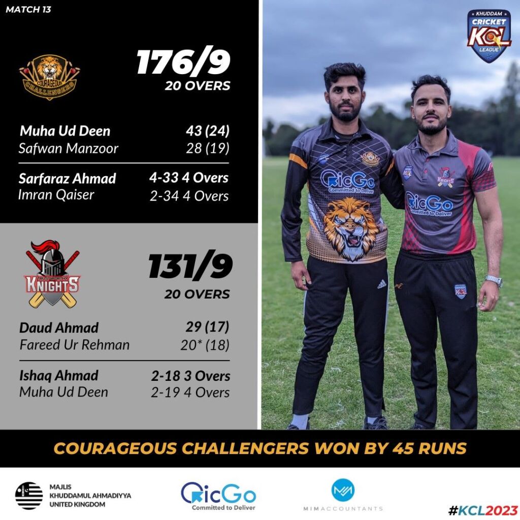 It is hard to go past Muha Ud Deen’s all round efforts today for the MOTM award, although the 4-33 by Sarfaraz for the Knights should also be appreciated in ensuring his side were kept in the game through it. A good win for the Challangers, however the Knights are now in a real spot of bother with only two more games to go for them and 3 points on the board. Another defeat can be critical in the campaign of last year’s finalists!