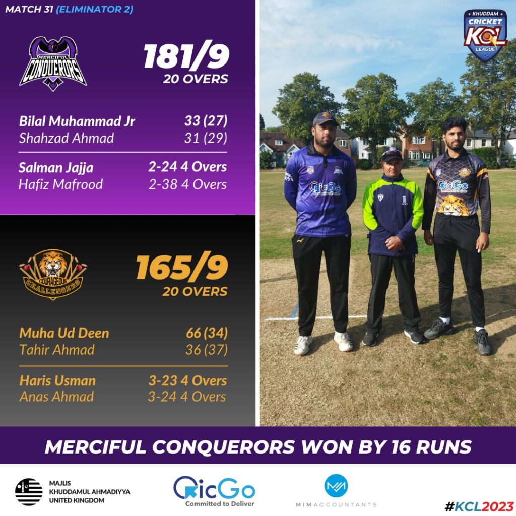 A semi-final of high pressure, elite performances, and top quality cricket came to a close with the Conquerors marching on to face the Royals. Haris Usman 3-23 in a high scoring game was crucial for his side to defend the total (awarded MOTM), but the clutch performance by Muha Ud Deen (66 off 34) will be one to remember for ages, as he singlehandedly nearly stole the show.