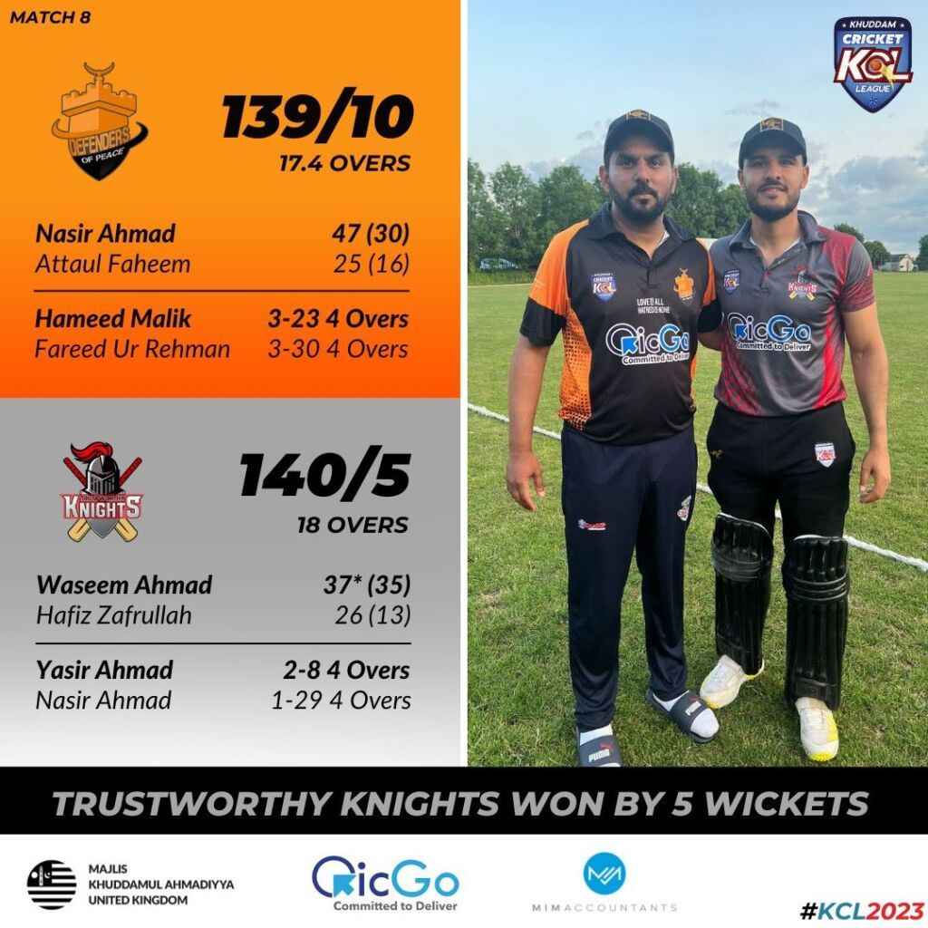 The Knights needed a victory, and they achieved this successfully with Waseem being awarded the MOTM. The Defenders would be rueing their batting efforts, having been in a good position at 91-3 and not making enough to pose a strong total to defend.