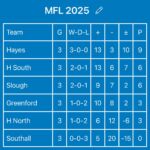Matchweek 3 of the 2025 MFL season delivered excitement across all three fixtures. Hounslow North edged out rivals Hounslow South in a thrilling 4-3 local derby, Hayes proved their title credentials with a dominant victory over Slough, and Greenford earned their first win of the season with an impressive 6-2 result against Southall. With three different storylines unfolding, the MFL title race is heating up.