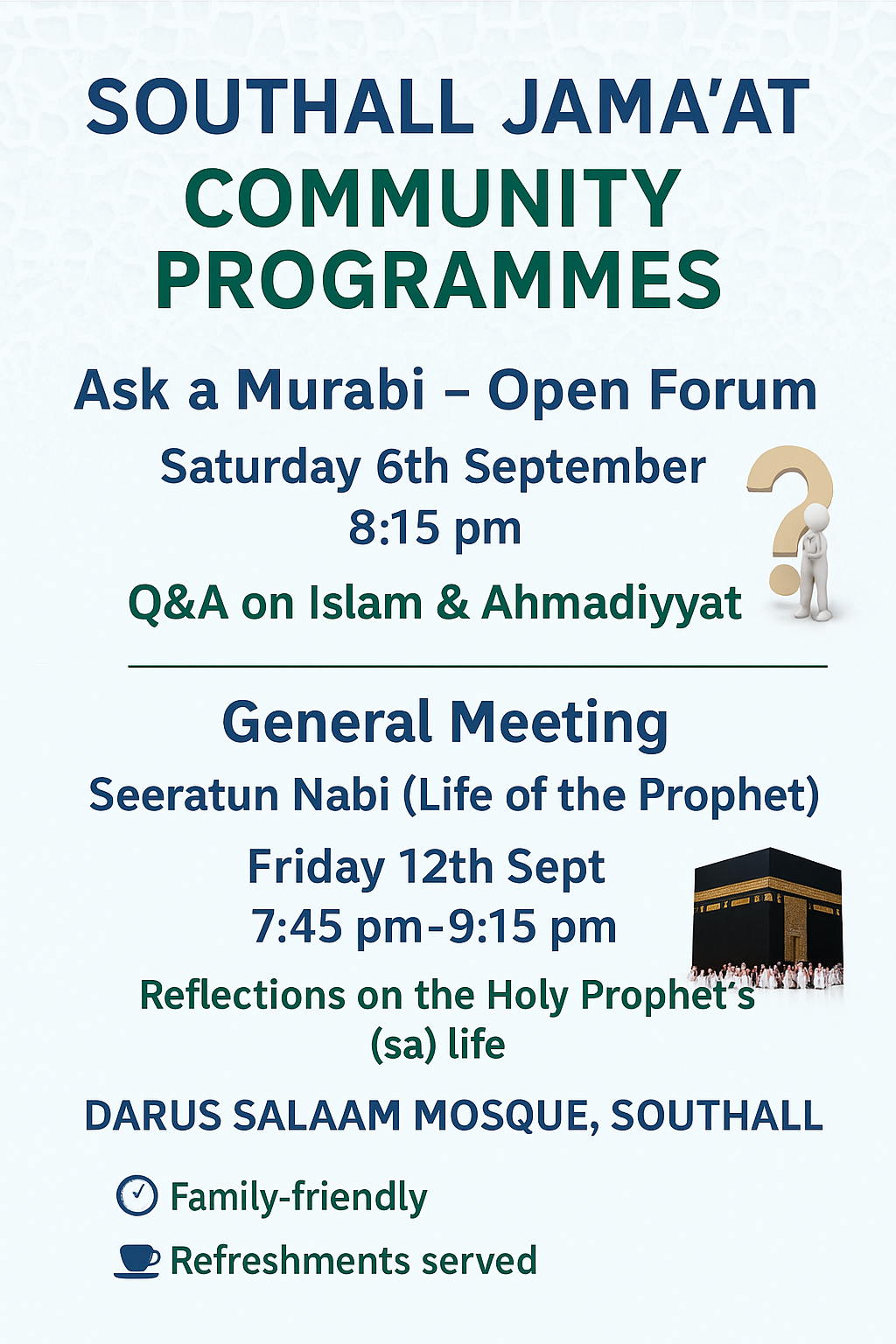 Both events were well received by the Southall Jamaat, who expressed their appreciation for the mosque’s efforts in providing opportunities for learning, discussion, and collective remembrance of faith. These gatherings not only enriched members spiritually but also reinforced the mosque’s role as a centre for dialogue, education, and unity.