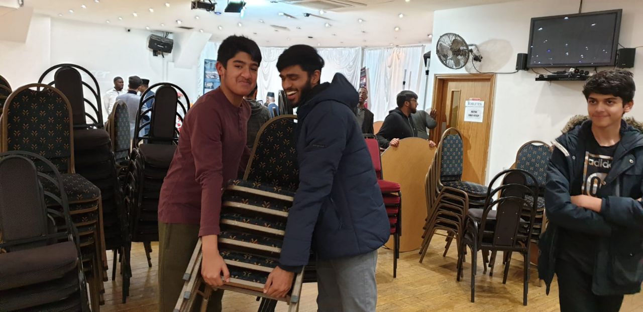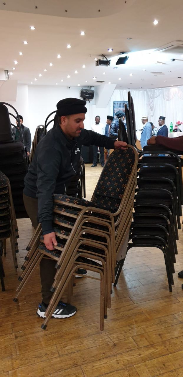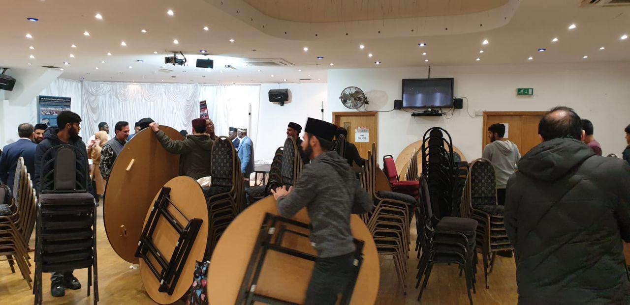 Khuddam arrived at 3 PM and started with the setup which included putting on covers for the chairs and placing plates and crockery on tables. The guests were then served with food by the khuddam.