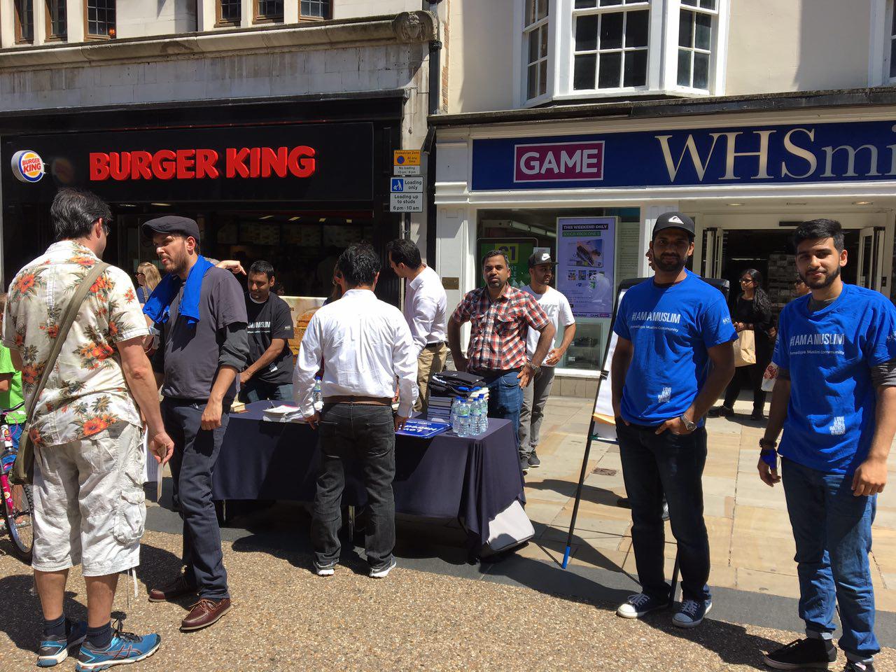 Bashir Region held a very successful Tabligh event in Oxford on 17 June 2017. Khuddam attended and participated in great numbers. There were 14 Khuddam in total doing Tabligh in Oxford Town centre. Khuddam were able to distribute a huge number of leaflets which was 900.
