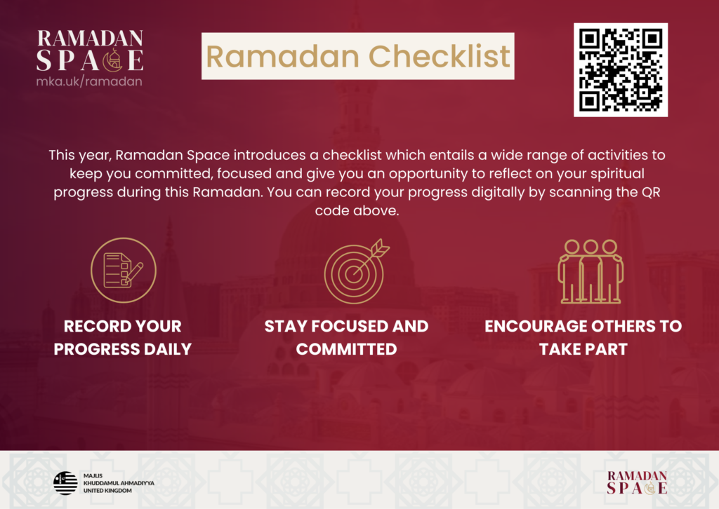 This year, the Checklist Challenge is open to all Khuddam who wish to take part. You will be required to complete all seven tasks throughout the month of Ramadan. You can mark your progress digitally at the end of each day using our entry point system.